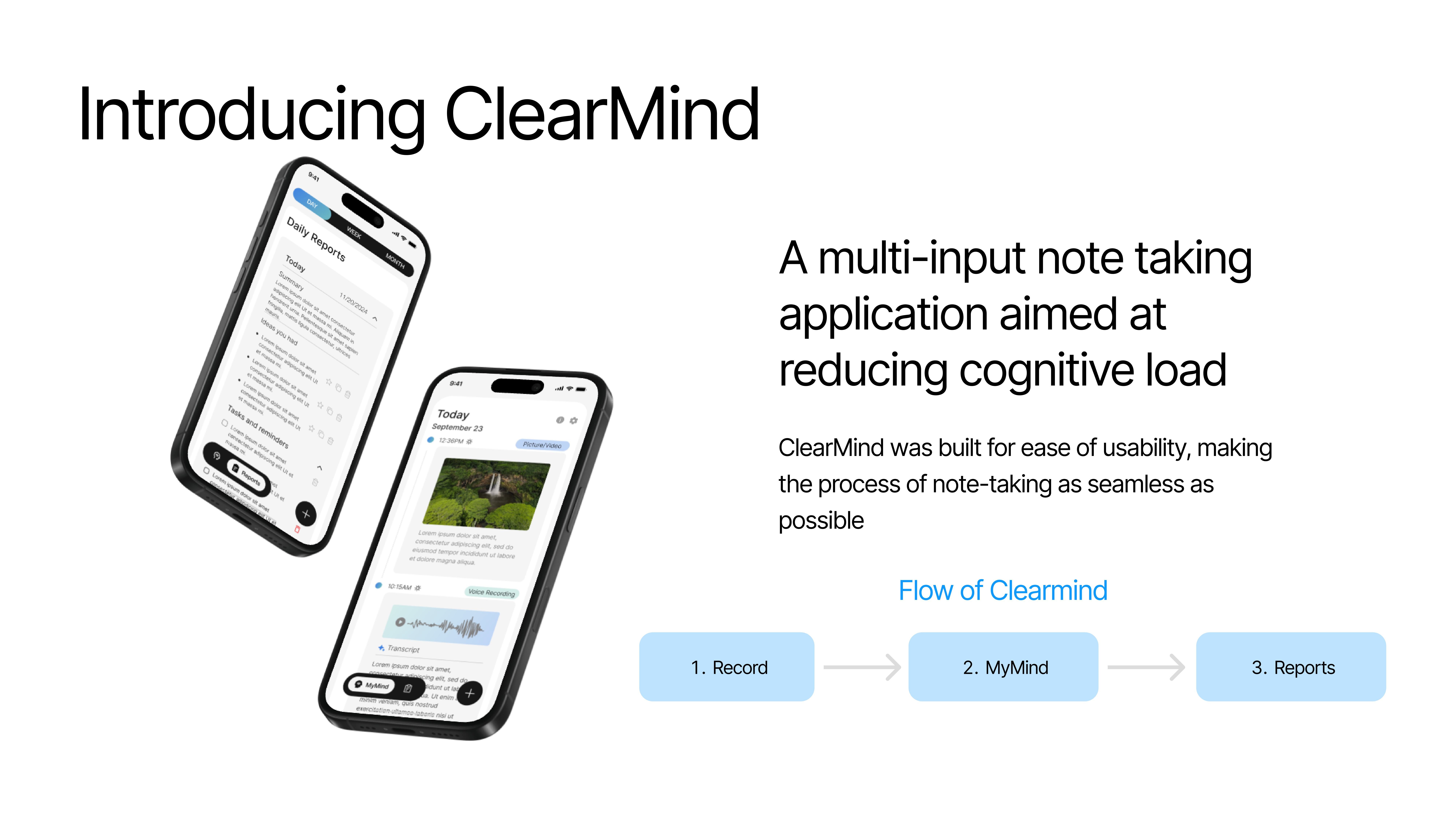 Visual Design Lead - In charge of the recording flow, was the primary visual designer and created ClearMind’s visual identity.