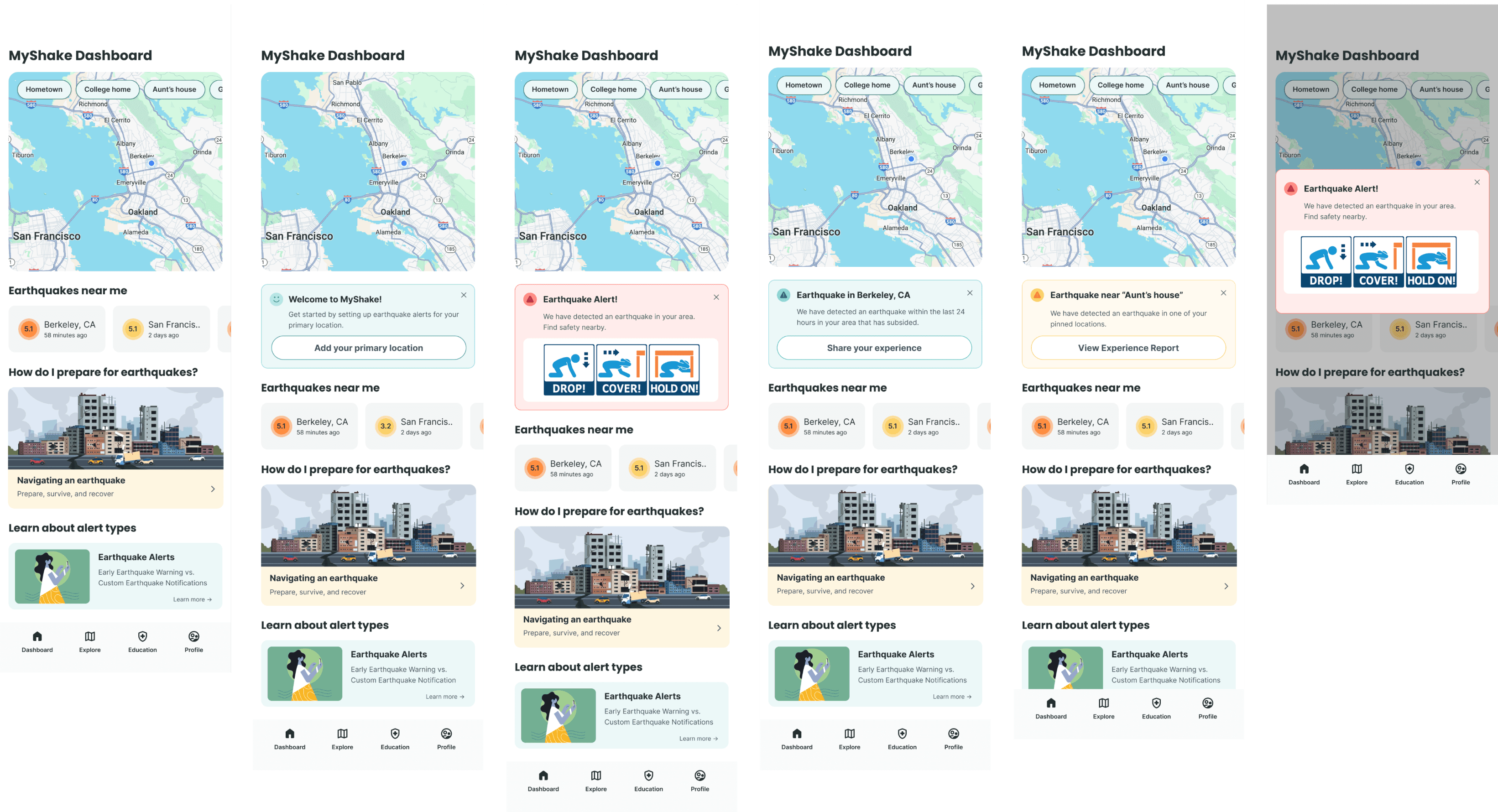 Redesigned MyShake from a passive information tool into a high-stakes navigation utility. Streamlined the information architecture to provide instant access to pinned family locations and critical safety status, reducing time-to-action during seismic events.